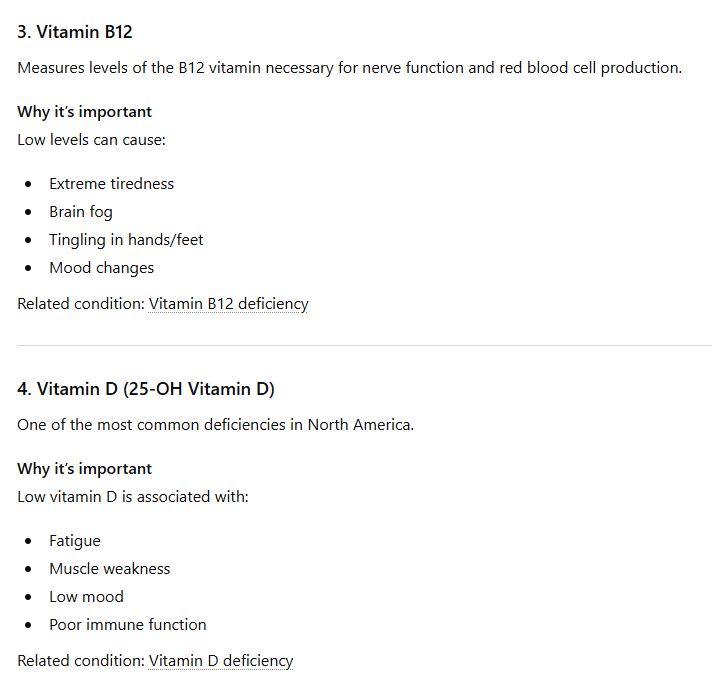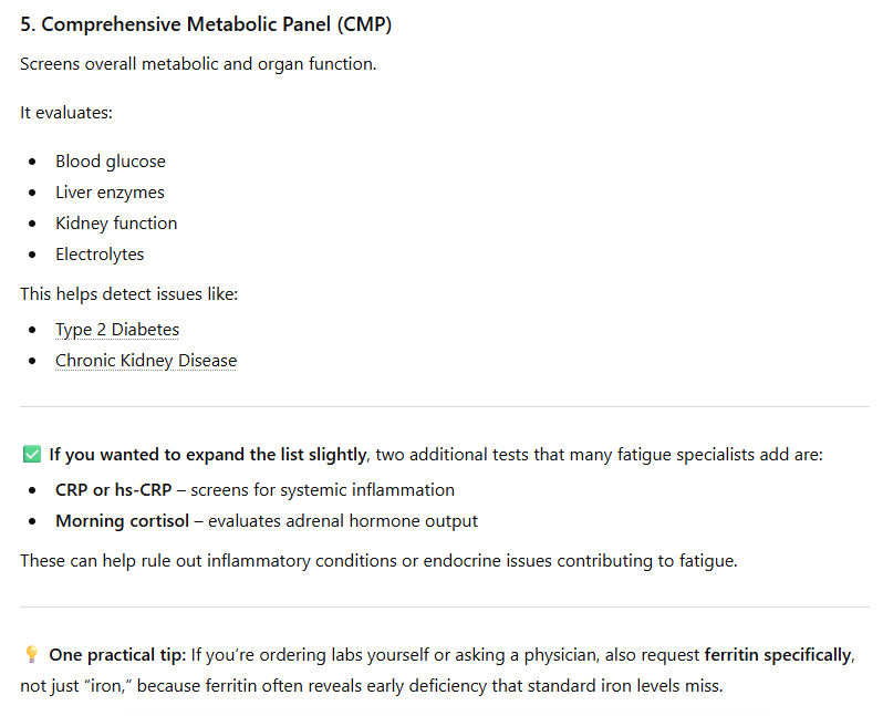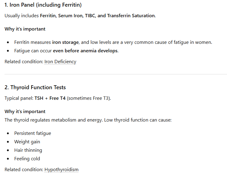 The following screenshots illustrate a strategic diagnostic interaction focused on identifying the physiological drivers of chronic fatigue for a 41-year-old female. By moving beyond standard markers and prioritizing high-sensitivity indicators like Ferritin—which often reveals iron storage issues long before clinical anemia appears—this analysis demonstrates how to map specific symptoms like brain fog, persistent exhaustion, and metabolic shifts to their biological roots. This process highlights the importance of a tiered testing strategy, incorporating essential thyroid function, critical vitamin levels, and comprehensive metabolic screening, while also identifying secondary markers like hs-CRP and morning cortisol to rule out systemic inflammation or endocrine dysfunction. At AvoVita Wellness, we provide the professional-grade laboratory access and curated solutions necessary to translate these high-level clinical insights into a definitive, actionable health strategy tailored to your unique requirements.